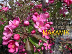 Erittäin näyttävä ja dekoratiivinen riippaoksainen ja punakukkainen koristeomenapuu.
